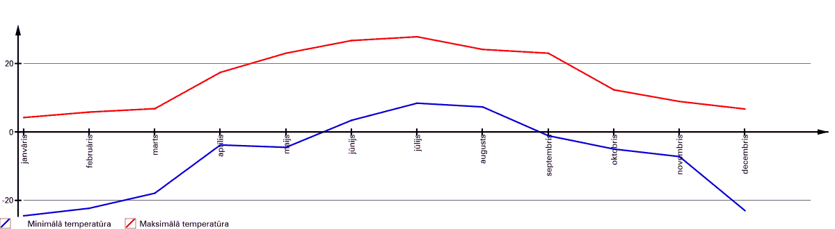 | Februāris | -22.30° | 5.80° | 28.10° | 19.20 mm |